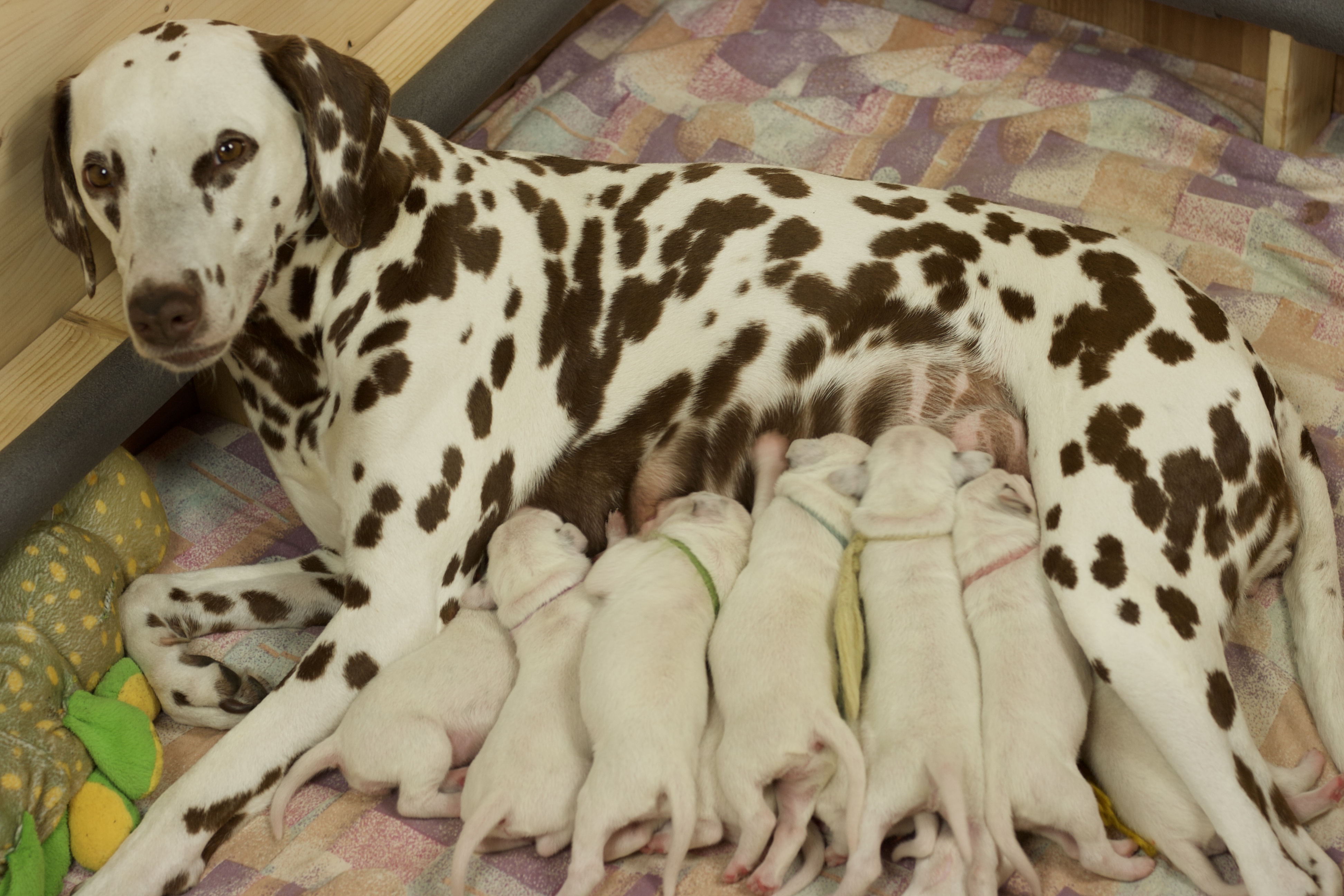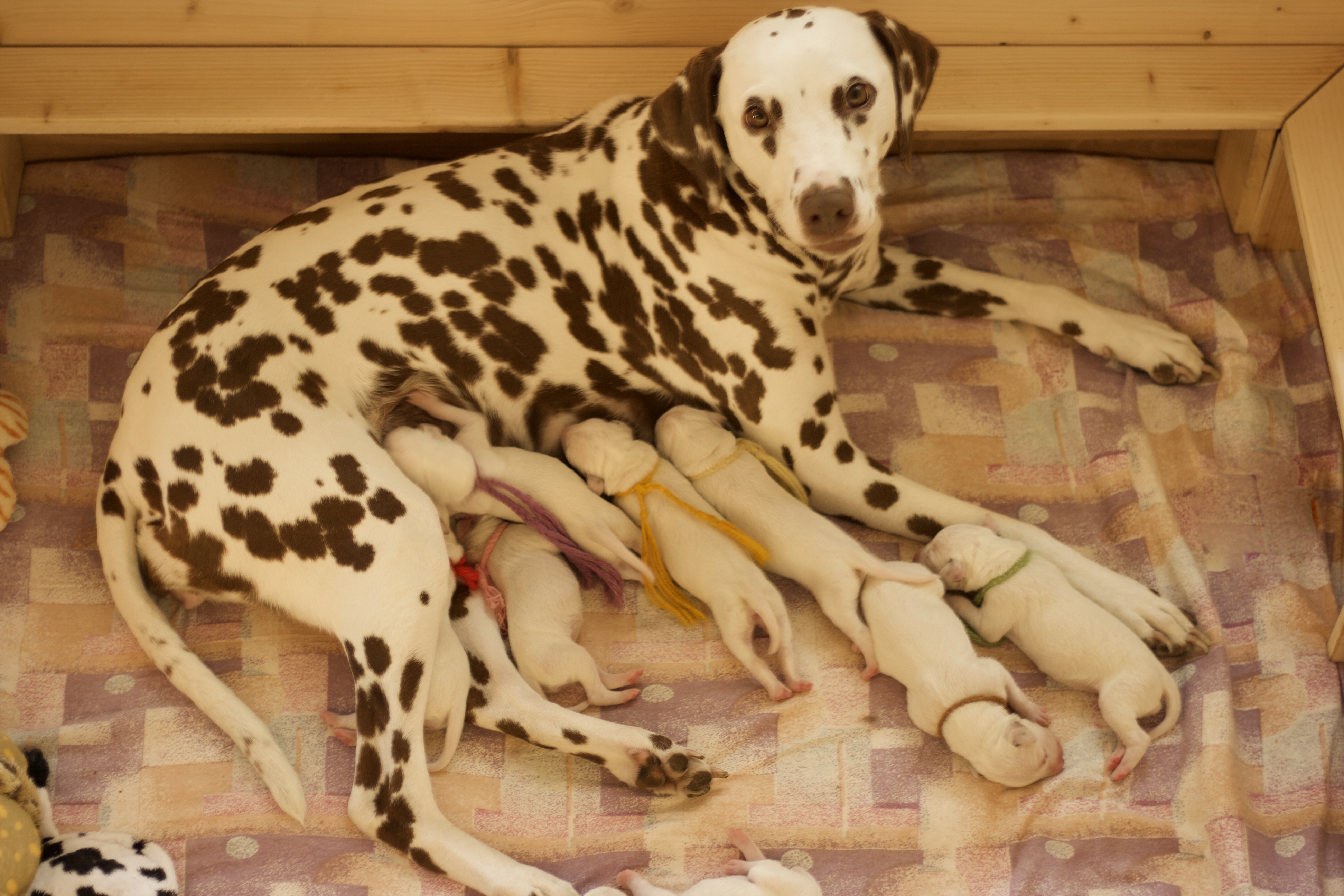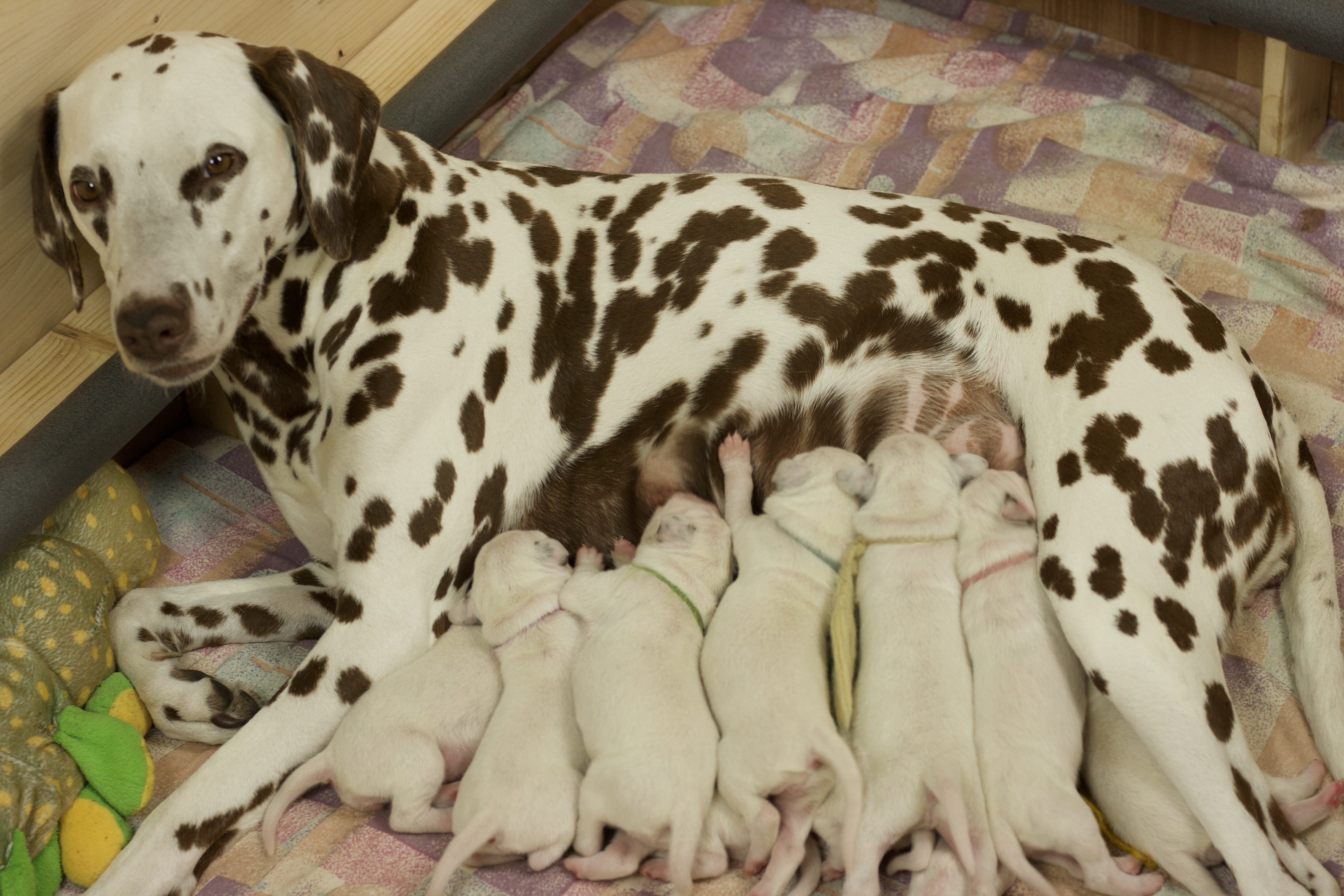 Die erste Lebenswoche geht jetzt ihrem Ende zu. Es ist ein Wahnsinn wie schnell sie verflogen ist. Wir sind ständig auf der Suche nach dem besten Platz an der Milchbar. Zum Glück hat unsere Mama 10 Zitzen und so können wir alle gleichzeitig dran. Wir haben aber auch schon gemerkt, dass das gar nicht so sinnvoll ist und sind jetzt meistens in 4er und 5er Gruppen am Start. Aber wenn der Hunger bei uns allen gleichzeitig kommt, müssen wir alle an die Milchbar. Unsere Mama kümmert sich mit großer Hingabe um uns auch wenn wir es gar nicht immer so toll finden, denn nach dem Essen wollen wir am liebsten gleich schlafen aber wie ihr alle wisst, muss man sich vor dem zu Bett gehen waschen und darauf achtet sie genau. Danach rollen oder robben wir uns an eine andere Stelle zum kuscheln und schlafen und das ist immer herrlich. Bis das Ganze wieder von Vorne losgeht.