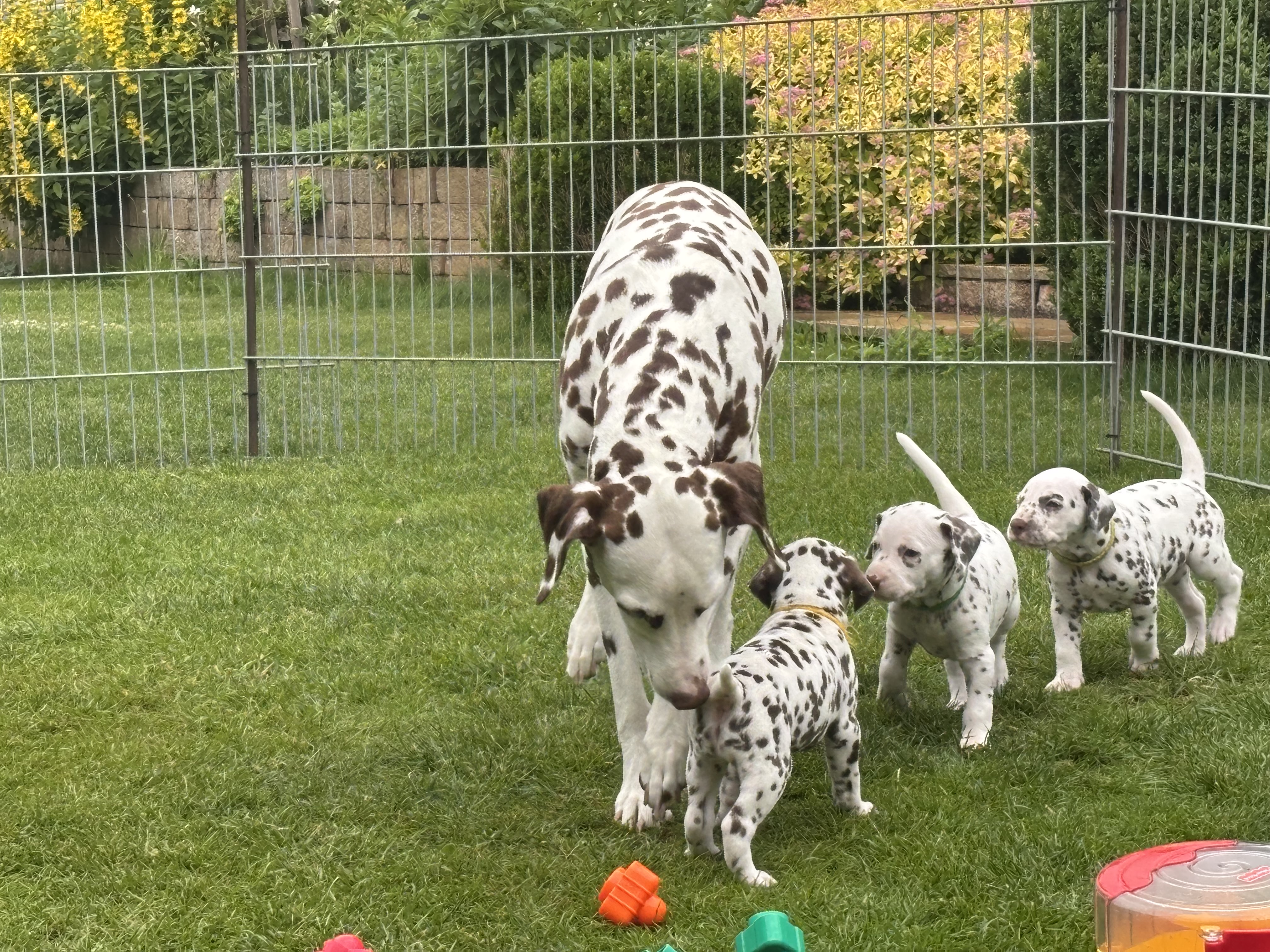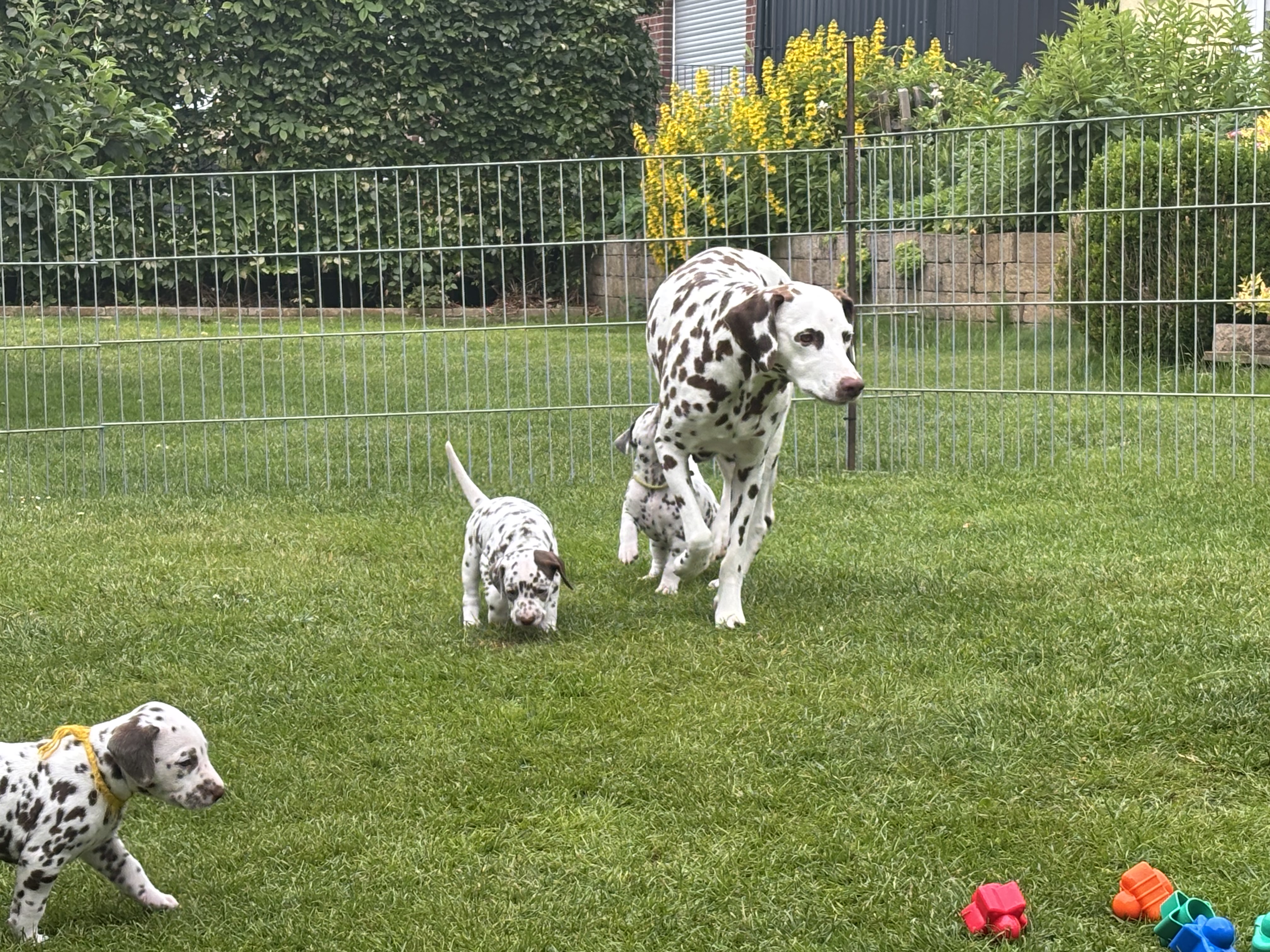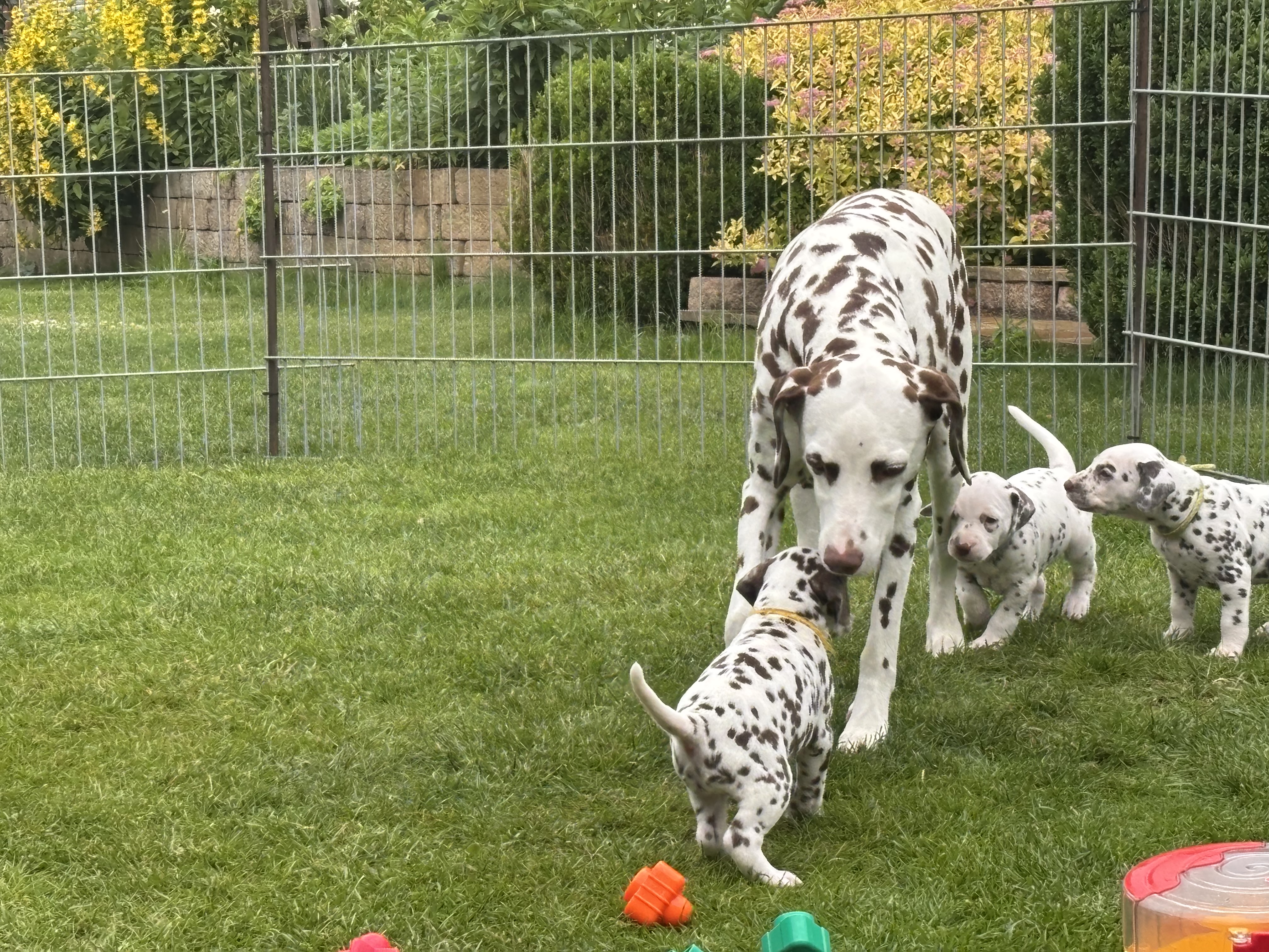Wir sind jetzt 4 1/2 Wochen alt sind und richtig gut zu Fuss unterwegs. Unsere Welt ist seit diesem Wochenende viel größer geworden, aber das ist auch gut so. So können wir viel besser mit Mama und Oma toben und es gibt so viel zu entdecken. Das erste Gewitter haben auch schon miterlebt und es hat uns überhaupt nicht gestört. Wir waren total gechillt. Die zweite Wurmkur haben wir auch hinter uns gebracht und es war gar nicht so schlimm. Aber jetzt genug der Worte schaut Euch unsere Fotos an. Was sagt Ihr? Wir sind ganz schön gewachsen. Oder?