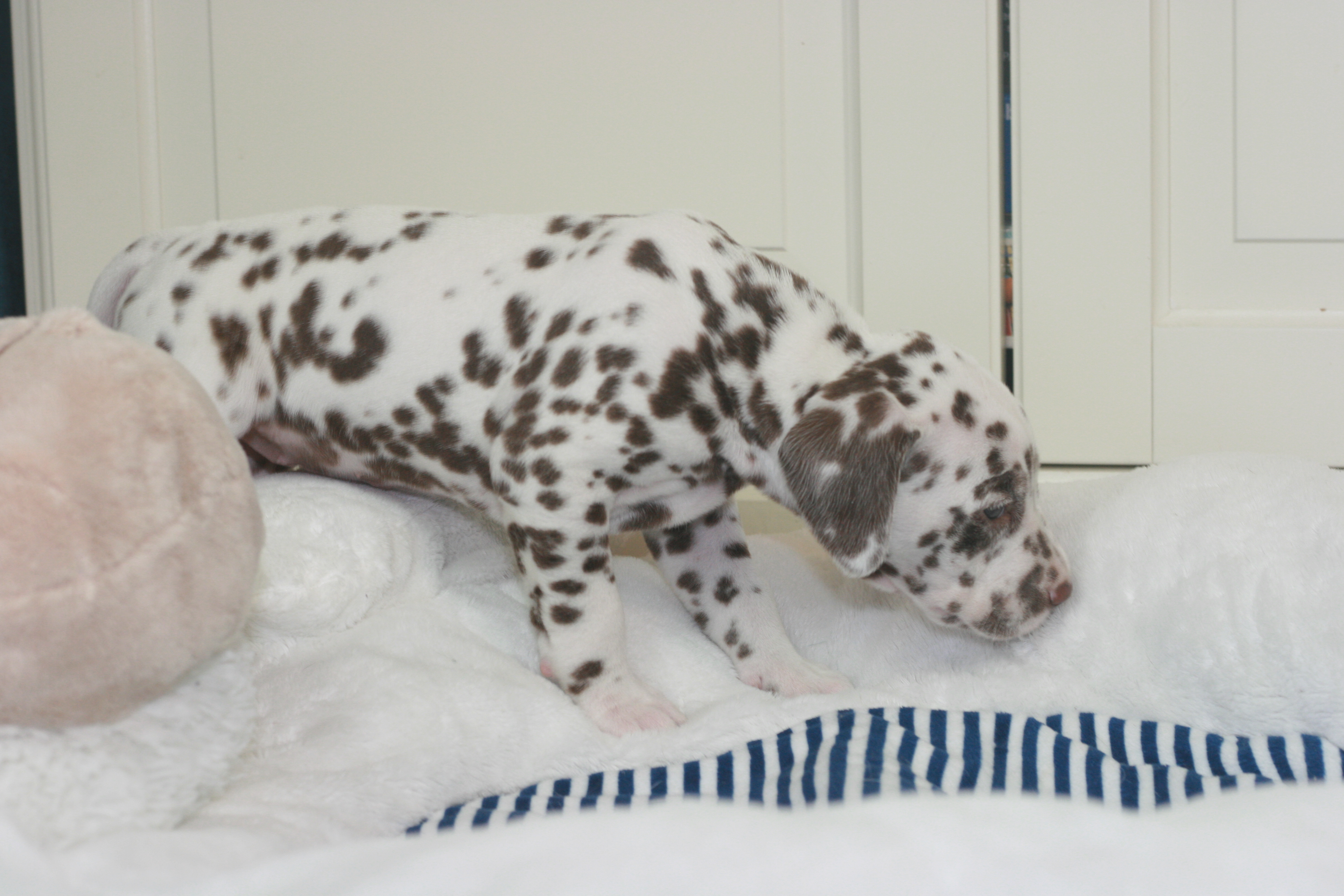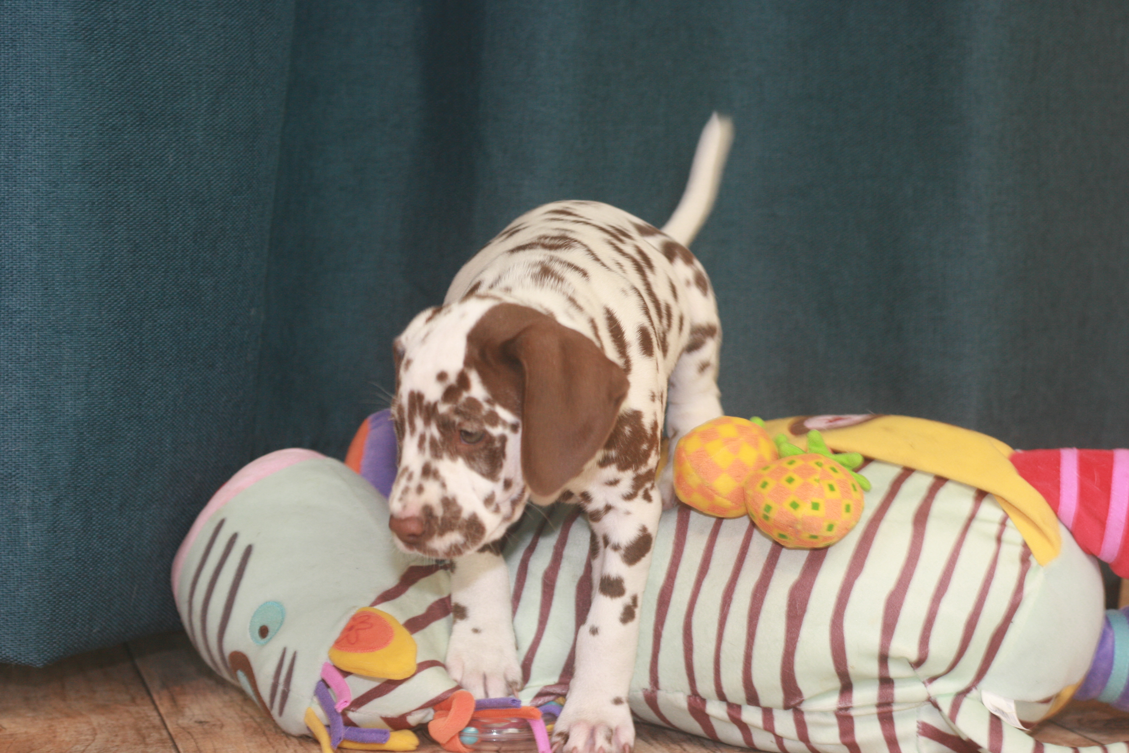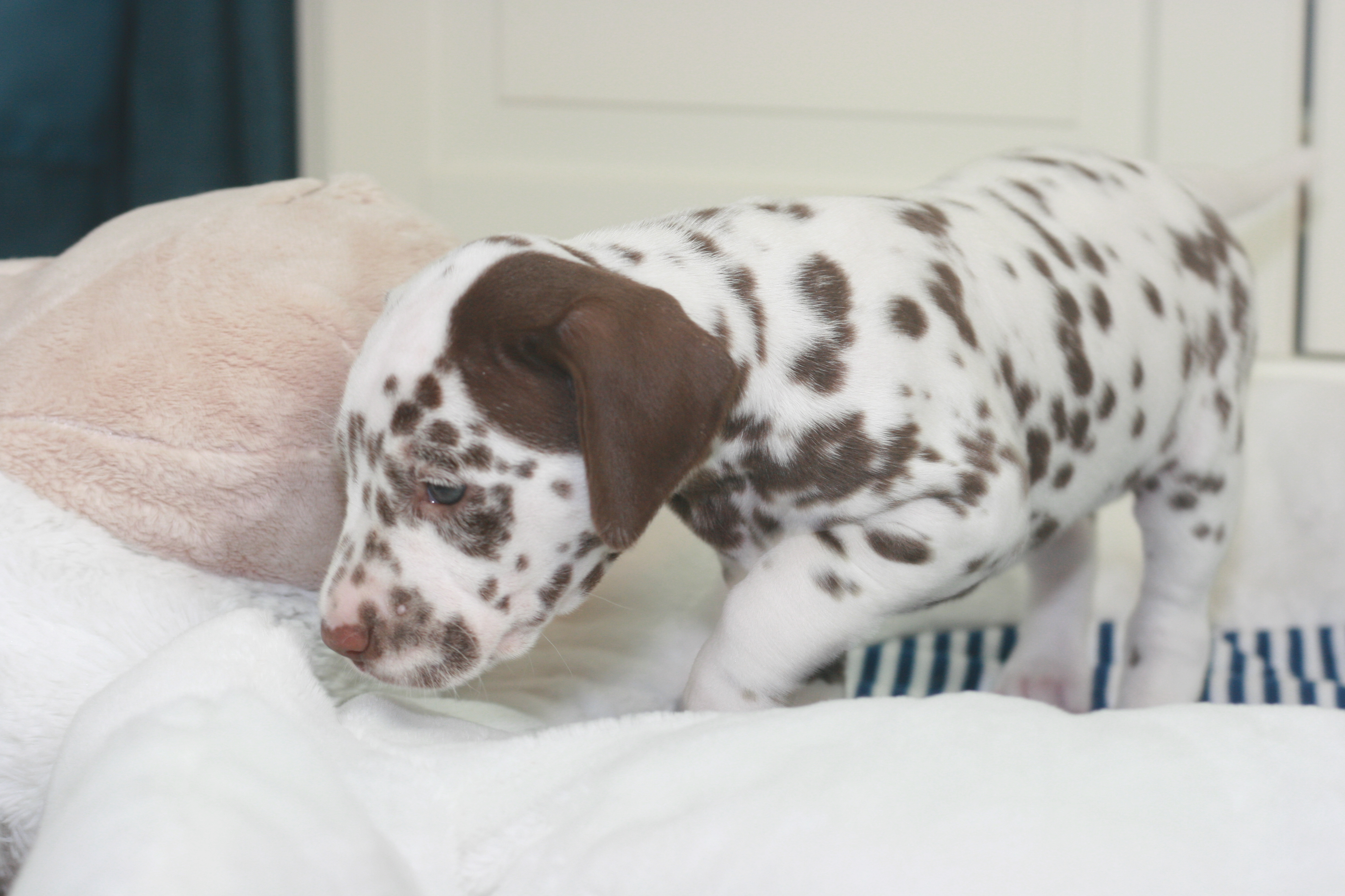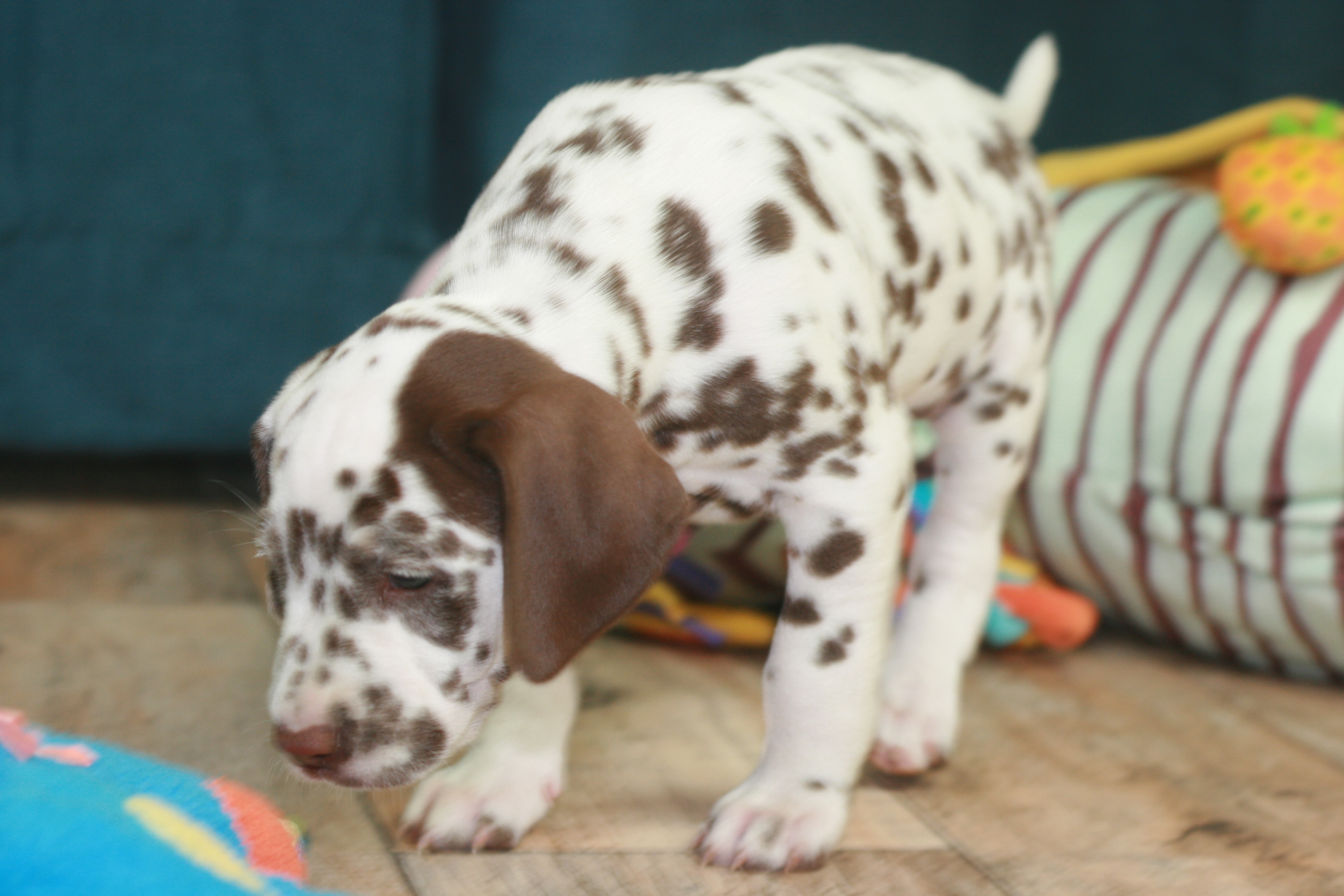 Fräulein Hellblau ist die Neunte und letzte aus unserem D-Wurf, die das Licht der Welt erblickt hat. Sie hatte ein Geburtsgewicht von 347g. Sie wird eine Weiss-Braune Hündin. Mittlerweile hat sie bereits ein Gewicht von 450g.